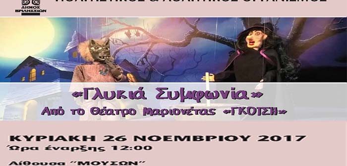 Ο Πολιτιστικός & Αθλητικός Οργανισμός του Δήμου Βριλησσίων παρουσιάζει την παιδική θεατρική παράσταση μαριονέτας «ΓΛΥΚΙΑ ΣΥΜΦΩΝΙΑ», την Κυριακή 26 Νοεμβρίου 2017 και ώρα 12.00, στο Πνευματικό Κέντρο, αίθουσα ‘Μουσών’.