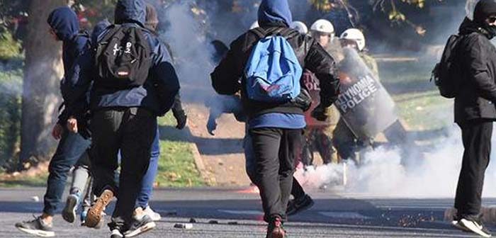 Πετροπόλεμος και χημικά αυτή την ώρα στα Προπύλαια, στο κέντρο της Αθήνας, λίγο πριν την έναρξη της μαθητικής πορείας για τα εννέα χρόνια από το φόνο Γρηγορόπουλου.