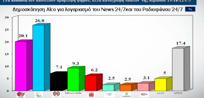 Ειδικότερα σύμφωνα με την έρευνα, που πραγματοποιήθηκε το διάστημα 15 με 18 Δεκεμβρίου, στην πρόθεση ψήφου Τα κόμματα λαμβάνουν (σε παρένθεση τα αποτελέσματα της έρευνας που έγινε 12 με 14 Νοεμβρίου)