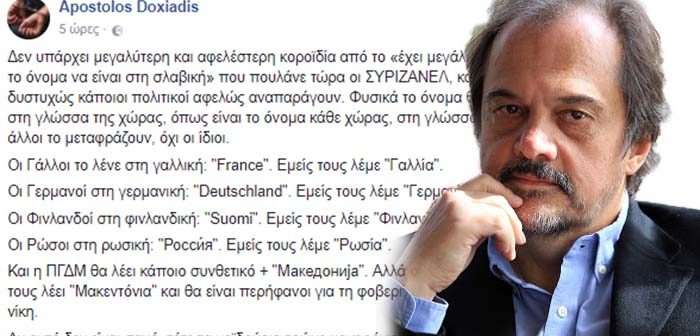 «Κοροϊδία» της κυβέρνησης ΣΥΡΙΖΑ-ΑΝΕΛ θεωρεί ο συγγραφέας Απόστολος Δοξιάδης το νέο σενάριο να ονομαστεί η πΓΔΜ με σλαβικό όνομα.