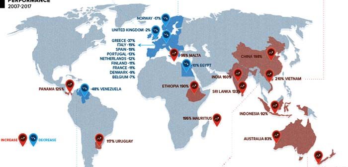 Στον αντίποδα, το Βιετνάμ που αύξησε τον πλούτο του τα τελευταία 10 χρόνια κατά 210%. Εντυπωσιακή η επίδοση και της οικονομίας της Κίνας που αύξησε τον πλούτο της κατά 198% αλλά και του Μαυρίκιου που επίσης διπλασίασε τον πλούτο του.