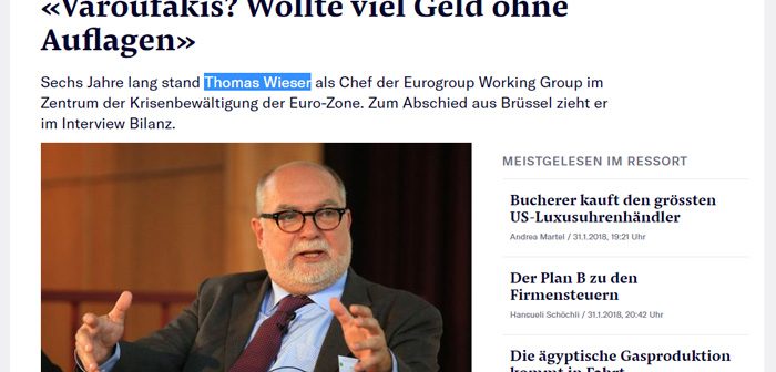 Διαβάστε ολόκληρη τη συνέντευξη του Τόμας Βίζερ στην ελβετική εφημερίδα Neue Zürcher Zeitung με τίτλο «Varoufakis? Wollte viel Geld ohne Auflagen», πατώντας ΕΔΩ