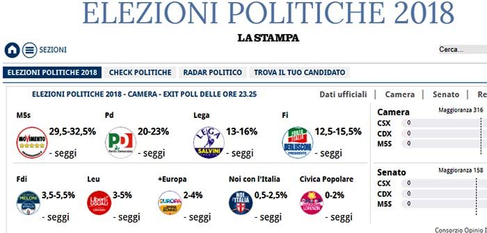 Mε βάση τα exit polls που παρουσίασε η ιταλική τηλεόραση, πρωτιά με 29%-32% καταγράφει το Κίνημα 5 Αστέρων του Μπέπε Γκρίλο.