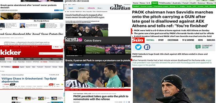 Τα διεθνή πολιτικά και αθλητικά ΜΜΕ κάνουν λόγο για «χάος» εστιάζοντας στην εισβολή του προέδρου της ΠΑΕ ΠΑΟΚ Ιβάν Σαββίδη στον αγωνιστικό χώρο με όπλο στη ζώνη του.