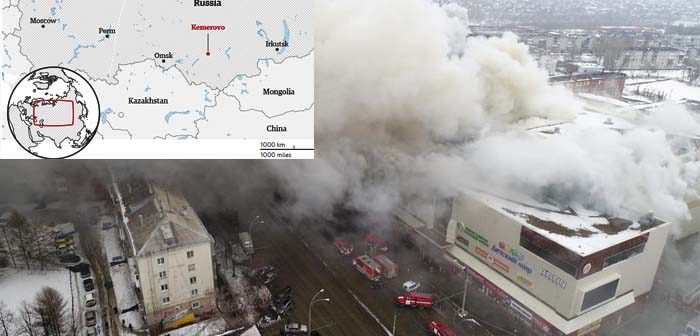 Σε φοβερή τραγωδία εξελίσσεται η φωτιά που εκδηλώθηκε χθες σε εμπορικό κέντρο, το οποίο που στεγάζει κινηματογράφους, εστιατόρια, μια αίθουσα μπόουλινγκ καθώς και πολλά καταστήματα, στο Κεμέροβο, που βρίσκεται στο νότιο τμήμα της Δυτικής Σιβηρίας ανατολικά της πόλης Νοβοσιμπίρισκ και βόρεια της Μογγολίας και του Καζακστάν, 3.600 χλμ ανατολικά της Μόσχας
