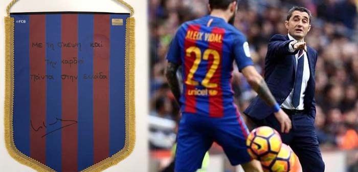 «Με τη σκέψη και την καρδιά πάντα στην Ελλάδα», ήταν το μήνυμα που έγραψε ο Ερνέστο Βαλβέρδε στο λάβαρο το οποίο θα δημοπρατηθεί για καλό σκοπό, μαζί με τη φανέλα του Τζόρντι Άλμπα με τις υπογραφές των παικτών της Μπαρτσελόνα!