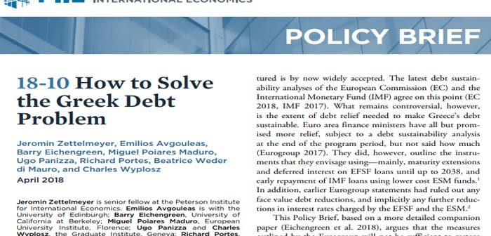 Διαβάστε το εισηγητικό μέρος της έκθεσης του Ινστιτούτου PETERSON, που ετοίμασε η ομάδα των [Jeromin Zettelmeyer (PIIE), Emilios Avgouleas (University of Edinburgh), Barry Eichengreen (University of California, Berkeley), Miguel Poiares Maduro (European University Institute, Florence), Ugo Panizza (Graduate Institute, Geneva), Richard Portes (London Business School), Beatrice Weder di Mauro (INSEAD, Singapore) and Charles Wyplosz (Graduate Institute, Geneva)] με τίτλο «How to Solve the Greek Debt Problem», στα αγγλικά πατώντας ΕΔΩ, καθώς και την πλήρη έκθεση, επίσης στα αγγλικά, πατώντας ΕΔΩ