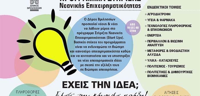 Ο Δήμος Βριλησσίων υλοποιεί το Πρόγραμμα Υποστήριξης της Νεανικής Επιχειρηματικότητας (Start Ups) με στόχο τη διάδοση του «επιχειρείν», τη στήριξη της νεανικής επιχειρηματικότητας και τη δημιουργία προϋποθέσεων για προσέλκυση καινοτόμων ιδεών και νέων ομάδων.