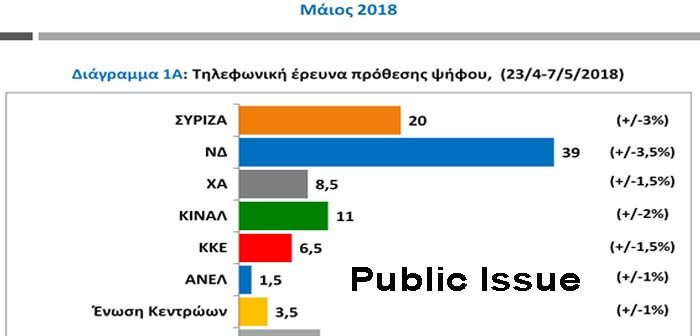 Με βάση την εκτίμηση εκλογικής επιρροής της Public Issue για τον Μάιο του 2018, προκύπτουν τα ακόλουθα βασικά συμπεράσματα:
