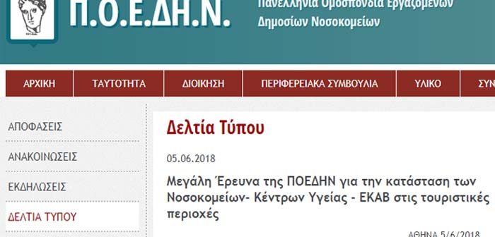 - Διαβάστε αναλυτική τη μεγάλη Έρευνα της ΠΟΕΔΗΝ για την κατάσταση των Νοσοκομείων- Κέντρων Υγείας – ΕΚΑΒ στις τουριστικές περιοχές πατώντας ΕΔΩ