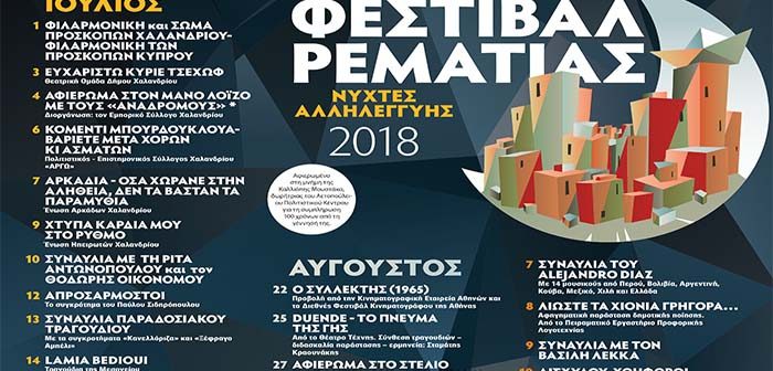 Ξεκινά την 1η Ιουλίου 2018 το Φεστιβάλ Ρεματιάς 2018 – Νύχτες Αλληλεγγύης. Το φετινό φεστιβάλ είναι αφιερωμένο στη μνήμη μιας σπουδαίας γυναίκας που προσέφερε πολλά στην πόλη, της Καλλιόπης Μουστάκα, δωρήτριας του Αετοπουλείου Πολιτιστικού Κέντρου του Δήμου Χαλανδρίου, με αφορμή τα 100 χρόνια από τη γέννησή της.