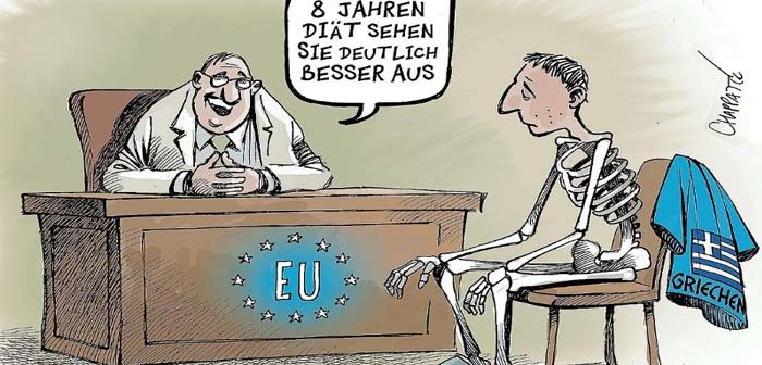 Στο σκίτσο εμφανίζεται ένας σκελετωμένος άνδρας να κάθεται μπροστά από το γραφείο ενός «γιατρού» με την επιγραφή EU.
