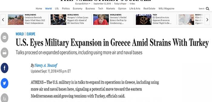 - Διαβάστε το πλήρες άρθρο της δημοσιογράφου Nancy A. Youssef, της αμερικάνικης εφημερίδας Wall StreetJournal με τίτλο «U.S. Eyes Military Expansion in Greece Amid Strains With Turkey» στα αγγλικά, πατώντας ΕΔΩ