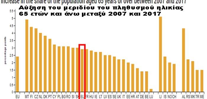 Σύμφωνα με τα στοιχεία της Eurostat (Population structure and ageing, Data estracted in May, 2018), την περίοδο 2007-2017 η αναλογία των ηλικιωμένων στον συνολικό πληθυσμό της Ευρωπαϊκής Ένωσης αυξήθηκε από 17% σε 19,4%, ενώ στην Ελλάδα από 18,6% σε 21,5%.