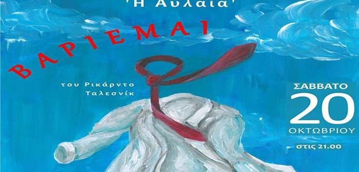Η Θεατρική Ομάδα Εκπαιδευτικών Ναυπάκτου “Η Αυλαία” με την στήριξη της Α΄ ΕΛΜΕ Αιτ/νιας παρουσιάζει το θεατρικό έργο “ΑΡΙΕΜΑΙ” του Ρικάρδο Τάλεσνικ,το Σάββατο 20/10/2018 στο Τρικούπειο Πολιτιστικό κέντρο στις 9.00 το βράδυ..
