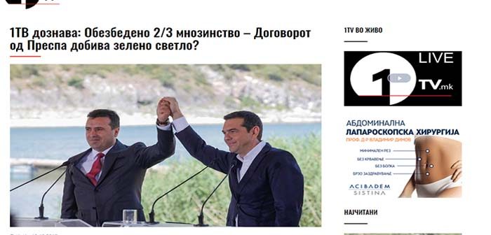- Διαβάστε το πλήρες δημοσίευμα του σκοπιανού τηλεοπτικού δικτύου 1TV με τίτλο «1ТВ дознава: Обезбедено 2/3 мнозинство – Договорот од Преспа добива зелено светло?», στη σκοπιανή γλώσσα πατώντας ΕΔΩ