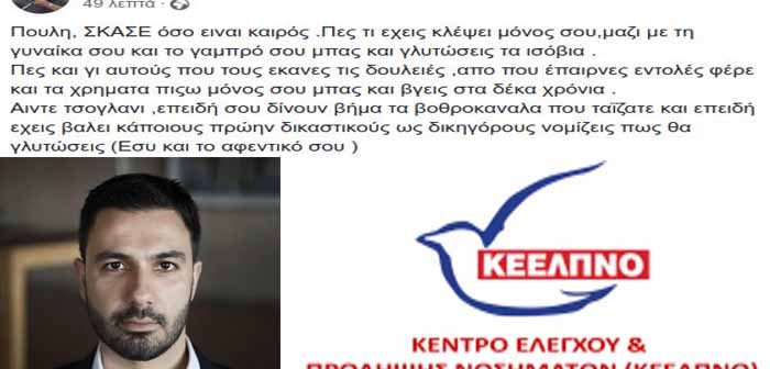 Ο αναπληρωτής υπουργός Υγείας, όπως το συνηθίζει άλλβστε, μέσω των sodial media με εκφράσεις πεζοδρομιακού χαρακτήρα, που μόνο αριστερά δεν θυμίζουν, όπως «σκάσε» και «τσογλάνι» αναφέρεται στον κ.Πουλή, από το οποίο ζητά: «Πες τι έχεις κλέψει μόνος σου, μαζί με τη γυναίκα σου και το γαμπρό σου μπας και γλυτώσεις τα ισόβια», ενώ τον καλεί να φέρει χρήματα πίσω.