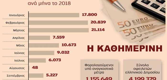 Μάλιστα, η εφορία κατάφερε να εισπράξει μέσω των κατασχέσεων αλλά και των ρυθμίσεων (πάγια ρύθμιση 12 δόσεων) το ποσό των 4,5 δισ. ευρώ από τις αρχές του έτους, αναφέρει η εφημερίδα ΚΑΘΗΜΕΡΙΝΗ και όπως όλα δείχνουν μέχρι το τέλος του έτους το ποσό θα εκτιναχθεί στα 6 δισ. ευρώ. Το μεγάλο κύμα των κατασχέσεων πραγματοποιήθηκε το πρώτο τρίμηνο του 2018 και έκτοτε η εφορία έχει «κόψει» ρυθμό εξαιτίας κυρίως των άδειων τραπεζικών λογαριασμών, αλλά και της φορολογικής συμμόρφωσης αρκετών οφειλετών του Δημοσίου. Το εντυπωσιακό πάντως είναι ότι τον μήνα της εξόδου από το μνημόνιο οι κατασχέσεις έπεσαν κάθετα. Συγκεκριμένα, τον Αύγουστο έγιναν μόλις 48 κατασχέσεις, τον Σεπτέμβριο 5.227 και τον Οκτώβριο 7.066.