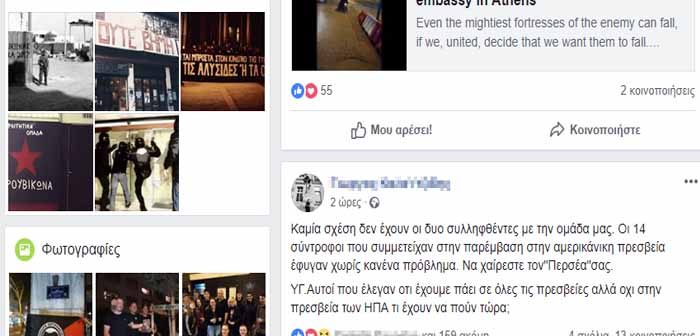 «Καμία σχέση δεν έχουν οι δυο συλληφθέντες με την ομάδα μας. Οι 14 σύντροφοι που συμμετείχαν στην παρέμβαση στην αμερικάνικη πρεσβεία έφυγαν χωρίς κανένα πρόβλημα. Να χαίρεστε τον”Περσέα”σας.