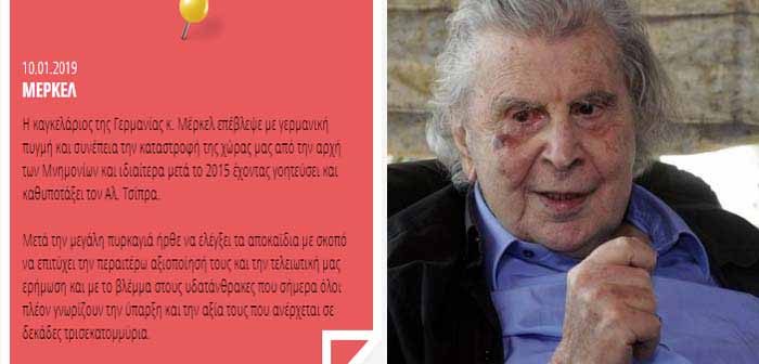Με σκληρά λόγια καταφέρθηκε εναντίον της Άνγκελα Μέρκελ και του Αλέξη Τσίπρα σε χθεσινό του κείμενο ο Μίκης Θεοδωράκης, με αφορμή την επίσκεψη της Γερμανίδας καγκελαρίου στην χώρα μας.