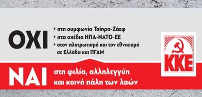 «Όχι στη Συμφωνία Τσίπρα – Ζάεφ, Όχι στα σχέδια ΗΠΑ-ΝΑΤΟ-ΕΕ, Όχι στον αλυτρωτισμό και τον εθνικισμό – Ναι στη φιλία-αλληλεγγύη και κοινή πάλη των λαών».