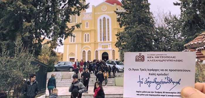 Θετικά ανταποκρίθηκαν οι μαθητές της Αλεξανδρούπολης στο κάλεσμα του Μητροπολίτη Άνθιμου να παρευρεθούν στη Θεία Λειτουργία για τη γιορτή των Τριών Ιεραρχών, μιας και δεν πήγαν στο σχολείο λόγω της αργίας των Τριών Ιεραρχών.
