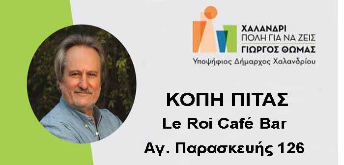 Την Κυριακή 24 Φεβρουαρίου 2019 στις 11:30 ηδημοτική παράταξη «ΧΑΛΑΝΔΡΙ ΠΟΛΗ ΓΙΑ ΝΑ ΖΕΙΣ», με επικεφαλής τον Γιώργο Θωμά, κόβει την πρωτοχρονιάτικη πίτα της, στο Le Roi Café Bar, Αγ. Παρασκευής 126, (Σταθμός Μετρό Αγ. Παρασκευής).