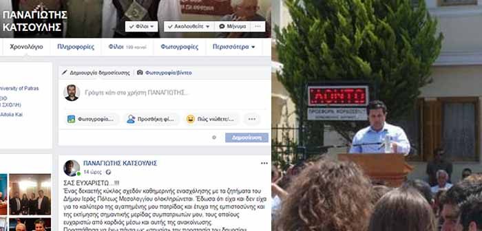 Ο πρώην Δήμαρχος Ι.Π. Μεσολογγίου, Παναγιώτης Κατσούλης, με ανακοίνωση ανακοινώνει ότι αποσύρεται και δεν θα ασχοληθεί με τον Δήμο Ι.Π. Μεσολογγίου γιατί «ανασφάλειες, εγωισμοί, ατομικά συμφέροντα και παρεμβάσεις τοπικών κομματικών παραγόντων, απέτρεψαν τη δημιουργία αυτής της μεγάλης ενωτικής δημοτικής παράταξης». Πάντως αναφέρει ότι θα παραμένει πολιτικά μάχιμος στον χώρο της αυτοδιοίκησης. «δηλώνω παρών και παραμένω πολιτικά μάχιμος στο χώρο της αυτοδιοίκησης ώστε να προσπαθήσω με τη στήριξη των πολιτών να βοηθήσω την αγαπημένη μου γενέθλια γη μέσω άλλου ρόλου, όπως το έχω πράξει και στο παρελθόν»3 αναφέρει στην ανακοίνωσή τους.