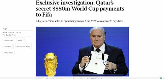 Η βρετανική εφημερίδα, εξηγεί ότι περίπου ένα δισεκατομμύριο δολάρια, έχουν καταβληθεί από το Κατάρ στη FIFA, σε κρίσιμες στιγμές, για να εξασφαλίσει την διοργάνωση του Μουντιάλ 2022. Είναι χαρακτηριστικό, δε, πως το ποσό για τα τηλεοπτικά δικαιώματα από το Al Jazeera θεωρείται εξωπραγματικό, δεδομένου πως είναι πενταπλάσιο από το συνηθισμένο.
