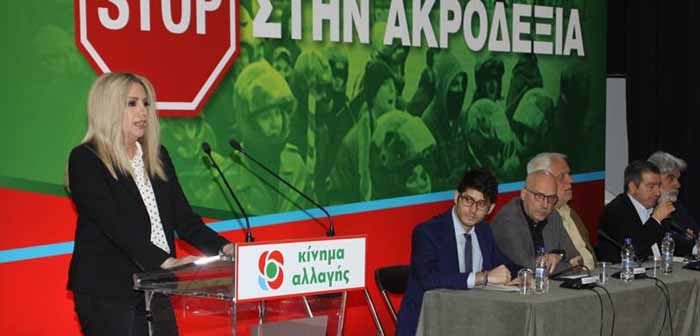 «Μαζί με τη νέα γενιά να ορθώσουμε τοίχο στην σύγχρονη Ακροδεξιά. Στο χέρι της νέας γενιάς είναι να γράψει τη δική της ιστορία και να βρεθεί στην πρώτη γραμμή του κοινού μας αγώνα κατά της Ακροδεξιάς. Είναι η μάχη της γενιάς τους. Στο Κίνημα Αλλαγής έχουμε συνείδηση της ιστορικής μας ευθύνης. Και δεν θα σας απογοητεύσουμε» κατέληξε η πρόεδρος του ΚΙΝΑΛ.