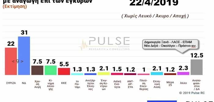 Αυτή η δημοσκόπηση της Pulse, που πραγματοποιήθηκε από τις 18 έως τις 21 Απριλίου (σε 1.356 άτομα) και στην πρόθεση ψήφου των ευρωεκλογών με αναγωγή επί των εγκύρων η διαφορά είναι 9 μονάδες υπέρ της ΝΔ.