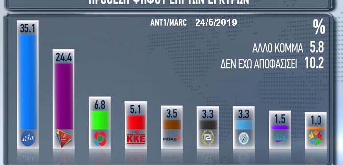 Σύμφωνα με τη δημοσκόπηση, που διενεργήθηκε τηλεφωνικά το διάστημα 19-23 Ιουνίου, σε 1214 νοικοκυριά σε όλη την χώρα, η ΝΔ προηγείται του ΣΥΡΙΖΑ στην πρόθεση ψήφου με 10,5 μονάδες, ενώ στην πρόθεση ψήφου επί των έγκυρων ψηφοδελτίων με 10,7μονάδες. Σύμφωνα με την εκτίμηση η ΝΔ θα καταλάβει 156 έδρες έναντι 75 του ΣΥΡΙΖΑ. Αναλυτικότερα στην πρόθεση ψήφου τα κόμματα λαμβάνουν: