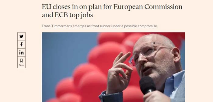 Σύμφωνα με το δημοσίευμα, είναι πιθανός ο συμβιβασμός που θα φέρει τον σοσιαλδημοκράτη Ολλανδό Φρανς Τιμμερμανς (Frans Timmermans)στο τιμόνι της Κομισιόν, κάτι που θα άρει το αδιέξοδο για τις άλλες ευρωπαϊκές θέσεις- κλειδιά. Σε μια τέτοια περίπτωση, ο Μάνφρεντ Βέμπερ (Manfred Weber) θα αναλάμβανε πρόεδρος του Ευρωπαϊκού Κοινοβουλίου, σύμφωνα με διπλωματικές πηγές των Βρυξελλών. Επίσης, τα «παζάρια», που είναι σε εξέλιξη, θα μπορούσαν να αναδείξουν τον Γάλλο Φρανσουά Βιγιερουά ντε Γκαλό διάδοχο του Μάριο Ντράγκι στην ΕΚΤ.