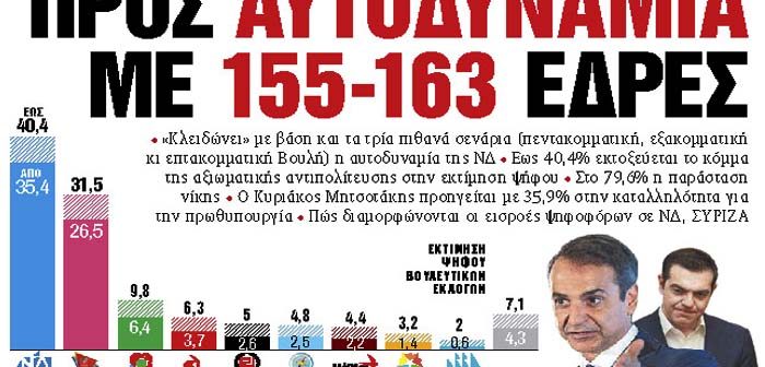 Σύμφωνα με την έρευνα, η ΝΔ εξασφαλίζει από 155 έως 163 έδρες. Συγκεκριμένα: