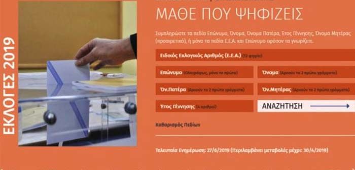 Όπως αναφέρεται στον αναλυτικό οδηγό που έχει δημοσιεύσει το ΥΠΕΣ, στις βουλευτικές εκλογές 2019 τα εκλογικά κέντρα θα είναι λιγότερα απ’ όσα ήταν στις τετραπλές κάλπες (ευρωεκλογές και αυτοδιοικητικές) του Μαΐου. Οι εκλογείς μπορούν αναζητούν το εκλογικό τμήμα στο οποίο μπορούν να ψηφίσουν μέσω της ειδικής πλατφόρμας «Μάθε που ψηφίζεις», που έχει θέσει σε λειτουργία το υπουργείο Εσωτερικών για τις βουλευτικές εκλογές 2019. Τα στοιχεία που πρέπει να συμπληρώσει κανείς στην πλατφόρμα είναι το ονοματεπώνυμο, τα ονόματα πατρός ή και μητρός ή και το ΑΦΜ.