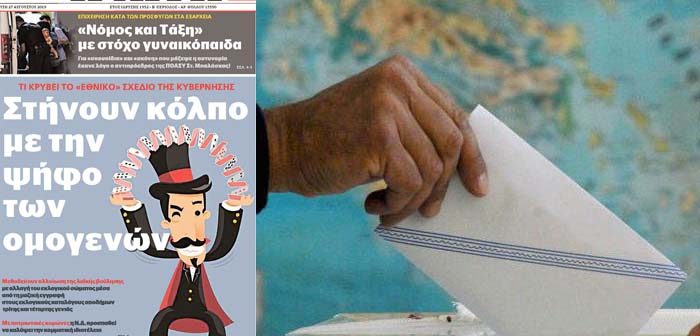Όπως αναφέρει η Αυγή στο πρωτοσέλιδό της, το κόλπο της κυβέρνησης προβλέπει την αλλαγή των πολιτικών συσχετισμών, μέσα από τη μαζική εγγραφή στους εκλογικούς καταλόγους αποδήμων τρίτης και τέταρτης γενιάς.