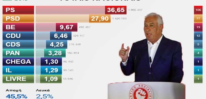 Με βάση τα σχεδόν οριστικά αποτελέσματα, η παράταξη του 58χρονου άλλοτε δημάρχου της Λισαβόνας συγκέντρωσε το 36,65% των ψήφων και θα διαθέτει τουλάχιστον 106 έδρες από το σύνολο των 230 του κοινοβουλίου, από 86 το 2015 και του χρειάζονται μόλις 19 έδρες για σχηματίσει κυβέρνηση