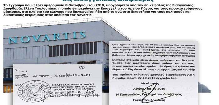 Το έγγραφο που φέρει ημερομηνία 8 Οκτωβρίου του 2019 υπογράφεται από την επικεφαλής της Εισαγγελίας Διαφθοράς Ελένη Τουλουπάκη, η οποία ενημερώνει την Εισαγγελία του Αρείου Πάγου για το πώς έγιναν τα πράγματα με τους προστατευόμενους μάρτυρες, στο πλαίσιο του ελέγχου που διενεργείται ήδη από το ανώτατο δικαστήριο για τους πολιτικούς και δικαστικούς χειρισμούς στην υπόθεση της Novartis.