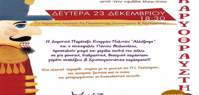 Η Δημοτική Παράταξη Ενεργών πολιτών «ΑΛΛΑΖΟΥΜΕ» και ο επικεφαλής Γιάννης Μυλωνάκης, προσκαλούν μικρά και μεγάλα παιδιά της πόλης σε ένα μοναδικό ταξίδι στον κόσμο των παραμυθιών και των Χριστουγέννων τη Δευτέρα 23/12/2018, στις 18.30, στο 7ο Δημοτικό Σχολείο (Λυκούργου & Αρτέμωνος, Αγία Παρασκευή).