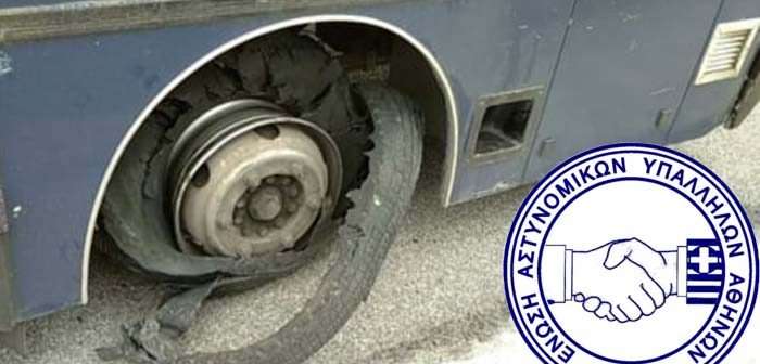 «Δυστυχώς για πολλοστή φορά είμαστε στη δυσάρεστη θέση να καταγγείλουμε τις ελλείψεις βασικών υπηρεσιακών ειδών, σε νευραλγικές Υπηρεσίες που ανήκουν γεωγραφικά στην Ένωση Αστυνομικών Υπαλλήλων Αθηνών, οι οποίες μάλιστα μπορεί να θέσουν σε κίνδυνο τη ζωή ή την σωματική ακεραιότητα των συναδέλφων μας. Συγκεκριμένα, την εβδομάδα που πέρασε, σε διμοιρία της Υ.Α.Τ. η οποία βρισκόταν σε διατεταγμένη υπηρεσία και κατευθυνόταν εκτός Αττικής, συνέβη το απίστευτο. Έσκασε εν κινήσει (!!!) το ένα από τα λάστιχα του υπηρεσιακού λεωφορείου και μόνο από την ικανότητα, την ψυχραιμία και την εμπειρία του οδηγού δεν είχαμε τα χειρότερα.
