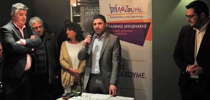 Ο επικεφαλής της δημοτικής παράταξης «ΑΛΛΑΖΟΥΜΕ», Γιάννης Μυλωνάκης, αφού καλωσόρισε όλους τους παρευρισκόμενους και ευχήθηκε να έχουν μια δημιουργική χρονιά, γεμάτη θετικές Αλλαγές, αναφέρθηκε στις πρόσφατες δημοτικές εκλογές στον Δήμο Αγίας Παρασκευής, αλλά και στη μέχρι σήμερα στάση που έχει κρατήσει η παράταξη, εντός κι εκτός Δημοτικού Συμβουλίου.
