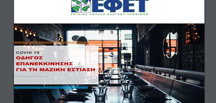 Ο Ενιαίος Φορέας Ελέγχου Τροφίμων (Ε.Φ.Ε.Τ.) σε συνεργασία με το Σύνδεσμο Ελληνικών Βιομηχανιών Τροφίμων (Σ.Ε.Β.Τ.) και την Ελληνική Ένωση Επιχειρήσεων Οργανωμένης Εστίασης (ΕΠ.Ο.ΕΣ), ενόψει της επαναλειτουργίας των επιχειρήσεων Μαζικής Εστίασης από τις 25 Μαΐου 2020, έδωσε στη δημοσιότητα τον “Οδηγό Επανεκκίνησης για τη Μαζική Εστίαση” με σκοπό την παροχή απλών και πρακτικών οδηγιών προσαρμογής στο πλαίσιο της νέας πραγματικότητας που έχει δημιουργηθεί από το COVID-19.
