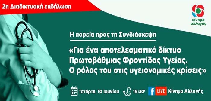 Το Κίνημα Αλλαγής στην πορεία για την Πολιτική και Ιδεολογική Συνδιάσκεψη, την Τετάρτη 10 Ιουνίου και ώρα 19:30, θα πραγματοποιηθεί η 2η ανοιχτή διαδικτυακή εκδήλωση του Κινήματος Αλλαγής με θέμα:«Για ένα αποτελεσματικό δίκτυο Πρωτοβάθμιας Φροντίδας Υγείας. Ο ρόλος του στις υγειονομικές κρίσεις».