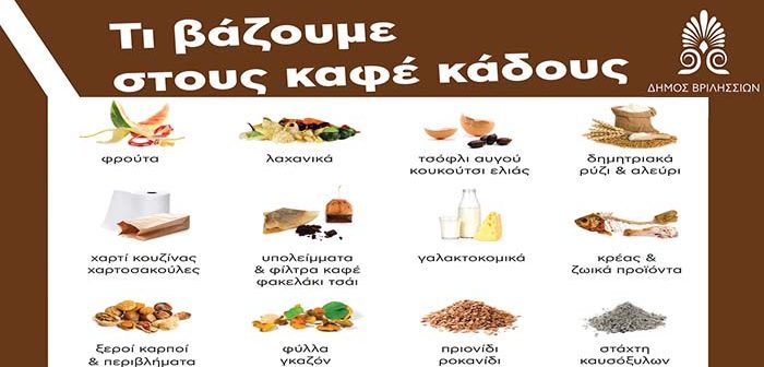 Παρακαλούμε μέσα στους ΚΑΦΕ κάδους να ρίχνονται μόνο τροφικά υπολείμματα τροφίμων. Δηλαδή ωμά ή μαγειρεμένα υπολείμματα από οργανικά απόβλητα, όπως φρούτα, λαχανικά, μαγειρεμένα φαγητά, αυγά, γαλακτοκομικά, κλαδιά, φύλλα, στάχτη από τζάκι, χαρτί κουζίνας, κ.α.