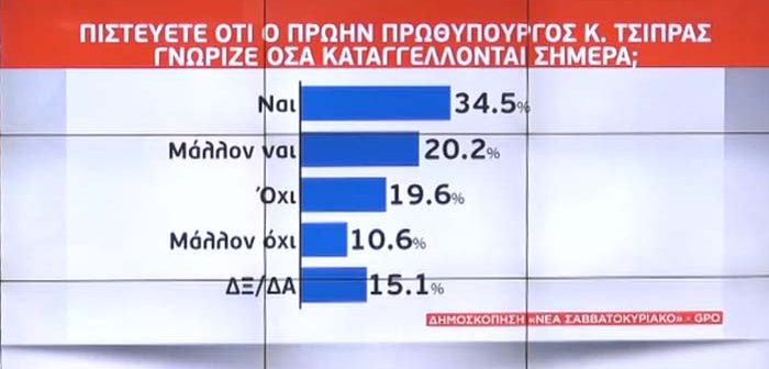 Με λίγα λόγια ένας στους δύο πολίτες, το 54,7%, πιστεύει ότι ο Αλέξης Τσίπρας γνώριζε τα πάντα.