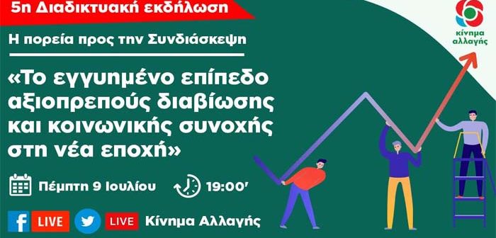 Το Κίνημα Αλλαγής στην πορεία για την Πολιτική και Ιδεολογική Συνδιάσκεψη, την Πέμπτη 9 Ιουλίου και ώρα 19:00, θα πραγματοποιήσει την 5η ανοιχτή διαδικτυακή εκδήλωση του Κινήματος με θέμα: «Το εγγυημένο επίπεδο αξιοπρεπούς διαβίωσης και κοινωνικής συνοχής στη νέα εποχή».