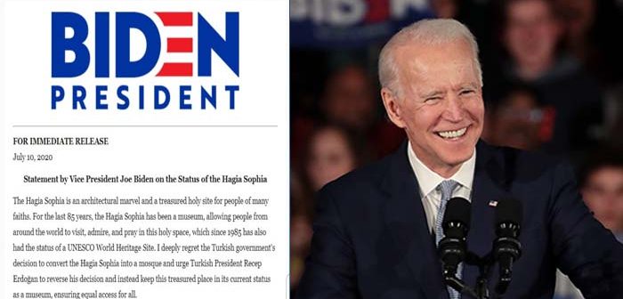 Να αναιρέσει την απόφασή του για τη μετατροπή της Αγίας Σοφίας σε τζαμί καλεί τον πρόεδρο της Τουρκίας Ρετζέπ Ταγίπ Ερντογάν, σύμφωνα με την ιστοσελίδα http://www.parikiaki.com/, ο Δημοκρατικός υποψήφιος για την προεδρία των ΗΠΑ Τζο Μπάιντεν, ο οποίος εκφράζει τη λύπη του, τονίζοντας ότι το μουσειακό καθεστώς του μνημείου εξασφαλίζει την ισότιμη πρόσβαση σε όλους.