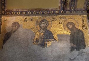 Ψηφιδωτό της Δέησης (13ος ), στο υπερώο (γυναικωνίτης) του Ναού. Η παράσταση απεικονίζει τον Χριστό στη μέση, αριστερά την Παναγία και δεξιά τον Ιωάννη τον Πρόδρομο.