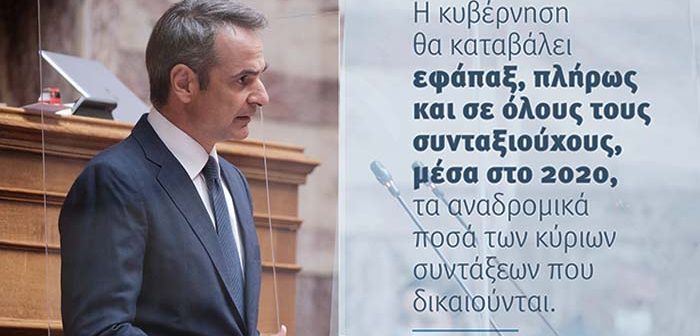 Από το βήμα της Ολομέλειας της Βουλής ο πρωθυπουργός Κυριάκος Μητσοτάκης ανακοίνωσε πως η κυβέρνηση θα καταβάλει εφάπαξ, πλήρως και σε όλους συνταξιούχους μέσα στο 2020 τα αναδρομικά.