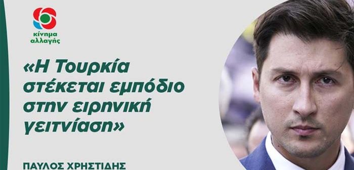 Εκτιμώντας ότι η Τουρκία λειτουργεί βάσει οργανωμένου σχεδίου εναντίον της χώρας μας, έχοντας ως στόχο το ορόσημο του 2023, ο εκπρόσωπος Τύπου του Κινήματος Αλλαγής Παύλος Χρηστίδης, χαρακτήρισε ως επιτακτικό να ορίσουμε την Εθνική μας Στρατηγική και να δούμε τι κάνουμε εμείς ως Ελλάδα απέναντι στις συνεχείς προκλήσεις της Τουρκίας.